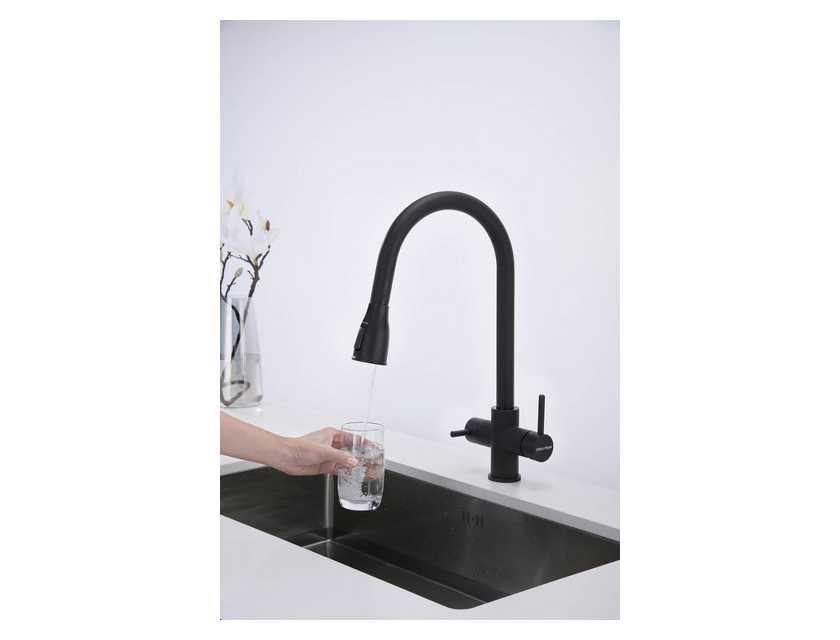 Конструкция смесителя с вытяжным шлангом значительно облегчает процесс мойки посуды или продуктов любого размера и формы.