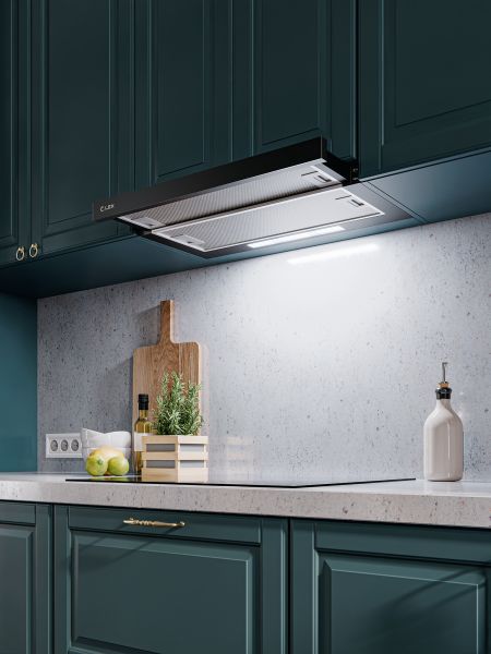 Встраиваемая вытяжка Hermes 600 легко и без лишнего шума справится даже с интенсивным запахом и дымом в большой кухне. Модель имеет две скорости работы, которые удобно переключать на клавишной панели управления. Комфортная подсветка зоны над плитой позволит готовить без дополнительного освещения, что особенно удобно для квартир с европланировкой. Вытяжка может работать в режиме рециркуляции, поэтому ее можно использовать и в кухне без вентиляционного выхода. Телескопическая конструкция дает возможность сэкономить место без потери производительности. Модель встраивается в кухонный шкафчик, видимой остается только узкая передняя панель, поэтому вытяжку можно установить в любую кухню, независимо от стиля интерьера.