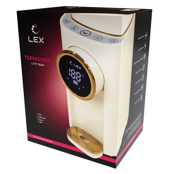 Термопот электрический LEX LXTP 3604 совместил в себе функции чайника и термоса. Встроенный таймер до 12 часов позволяет экономить электроэнергию и обеспечивает готовность кипяченной воды в нужное Вам время. Стальная внутренняя колба емкостью 5 литров с режимом постоянного поддержания выбранного уровня подогрева воды (45°, 55°, 65°, 85°, 95°, 100 °С) обеспечивает достаточный объем для чаепития в зависимости от вида заваривания разных сортов чая. Электронное управление в сочетании с информативным цифровым дисплеем делает термопот удобным и простым в использовании.