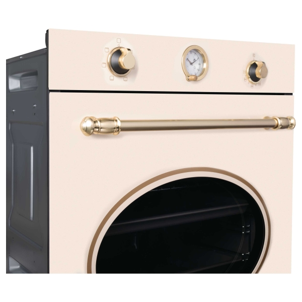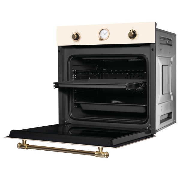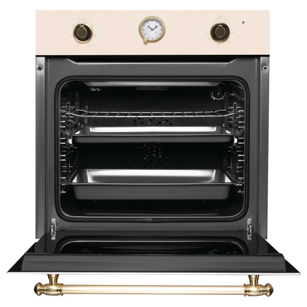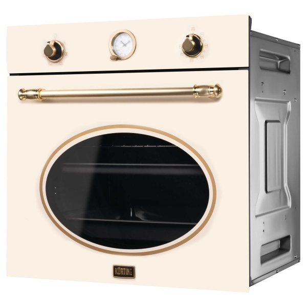 Электрический духовой шкаф OKB 461 CRGB KortingДуховой шкаф в ретро дизайне, аналоговые часы -с функцией времени, таймера и отключения, 6 режимов нагрева, объем духовки 64 л, телескопические направляющие на одном уровне, двухслойное остекление, каталитическая самоочистка, автоматическое отключение, металлический шильд с логотипом Korting, в комплекте: глубокий противень, противень для выпечки, хромированная решетка, цвет - слоновая клсть; цвет ручки и регуляторов - золото
